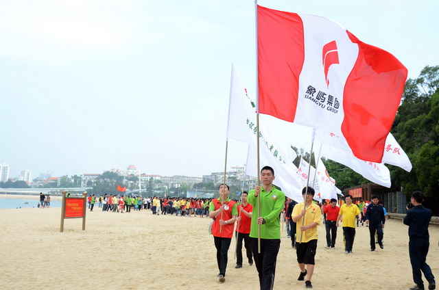 活動啟動儀式上,集團(tuán)公司黨委副書記、工會主席陳偉彬代表集團(tuán)領(lǐng)導(dǎo)班子向共建單位代表及全體員工致以節(jié)日的問候!陳副書記表示,我們要尊重勞動、謳歌勞動者;我們要倡導(dǎo)運動,褒獎優(yōu)勝者;我們崇尚遠(yuǎn)大的理想,憧憬美好的未來。海軍南方局李躍峰副政委對象嶼集團(tuán)在勇?lián)鐣?zé)任、傳承愛心善行方面所作的努力高度贊揚,并表示這對深入培育當(dāng)代革命軍人核心價值觀方面具有十分積極的推動促進(jìn)作用。隨后進(jìn)行了“象嶼集團(tuán)縱走俱樂部”授旗儀式,集團(tuán)總裁張水利為縱走俱樂部授旗,號召更多縱走愛好者“走在一起,樂在一起”!集團(tuán)及海軍南方局領(lǐng)導(dǎo)、十佳員工及志愿者代表鳴槍發(fā)令,全體人員在司旗的帶領(lǐng)下,向著音樂廣場出發(fā)了!
