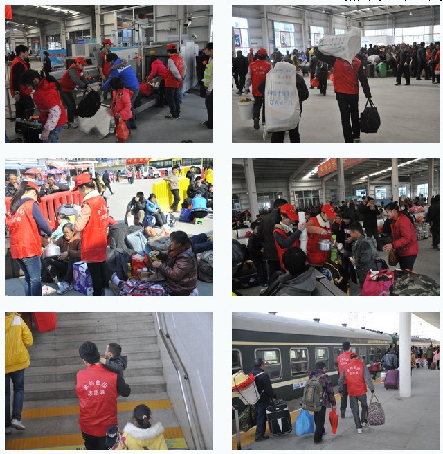 今年已是集團第三年組織參加春運服務。雖然是周末休息日,但我們的志愿者一早就到達服務區(qū)域:有的協(xié)助搭建志愿者暖洋洋服務站并駐點服務,有的負責整個廣場及候車廳外圍的引導和搬運,有的負責協(xié)助候車廳安檢及廳內(nèi)服務,還有的幫助那些攜幼提重的旅客順利登車。