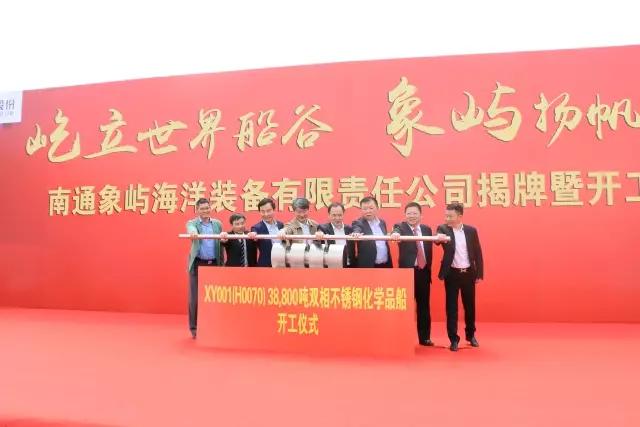 首制船“XY001”號38800噸不銹鋼化學品船同期開工。江蘇省經(jīng)信委副主任、國防科工委主任秦雁,南通市委常委、通州區(qū)委書記宋樂偉,南通市副市長徐新民,通州區(qū)區(qū)委副書記、區(qū)長陳永紅,華融航運金融租賃有限公司總經(jīng)理樊旭平,象嶼集團總裁陳方,中海重工董事局主席李明,南通象嶼副董事長朱建華,共同推動38800噸不銹鋼化學品船開工桿!