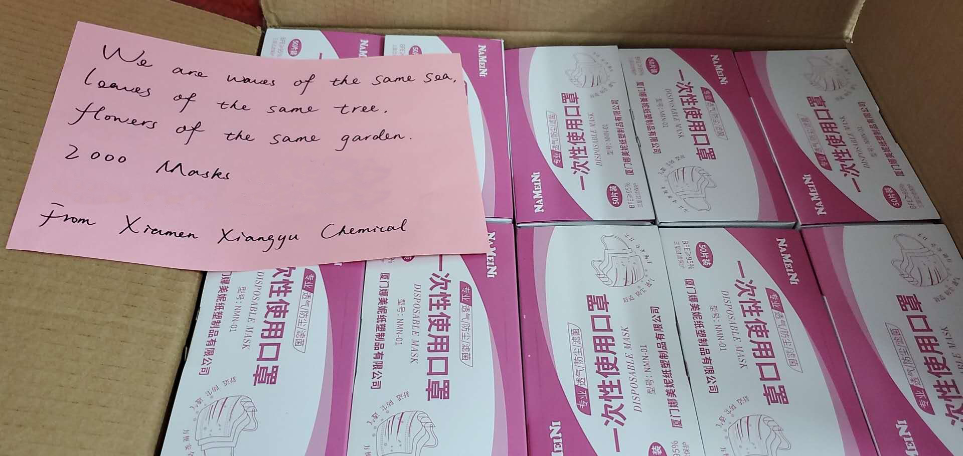 相似的故事同樣也發(fā)生在了象嶼股份旗下企業(yè)象嶼農產品公司。打開記憶盒匣,貼著“智利BLUMAR關心您”暖心字樣的口罩躍然眼前,那是象嶼農產品的長期合作伙伴BLUMAR SA公司在智利國內口罩存貨不多、購買困難的情況下用心為我司籌措得來的。隨著智利全國進入災難緊急狀態(tài),智利疫情形勢逐步嚴峻。滴水之恩,當涌泉相報。在了解到智利老伙伴的處境后,象嶼農產品在象嶼勝獅的協助下,兩個半小時就完成了10000個口罩的檢驗與裝箱工作,于4月10日迅速寄往智利。象嶼化工也早在3月便積極籌措防疫物資,向秘魯和法國友商寄出2500個口罩。