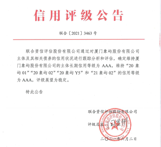6月2日,權(quán)威評級機(jī)構(gòu)聯(lián)合資信評估股份有限公司(以下簡稱“聯(lián)合資信”)出具《廈門象嶼股份有限公司公開發(fā)行公司債券2021年跟蹤評級報告》,維持