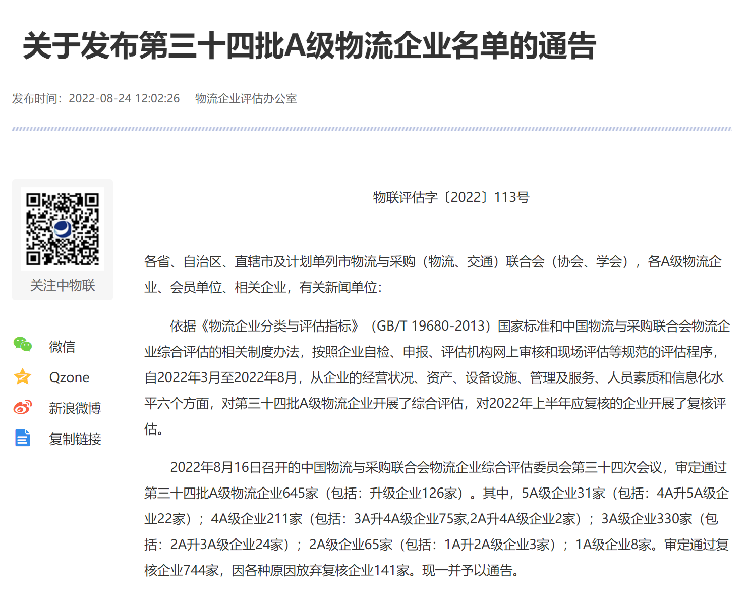 今天,中國物流與采購聯(lián)合會發(fā)布“全國第三十四批A級物流企業(yè)名單”,象嶼股份旗下企業(yè)象道物流集團(tuán)有限公司(以下簡稱:象道物流)以大宗商品物流可持續(xù)發(fā)展創(chuàng)新模式與實(shí)踐成果,榮膺最高評級國家5A級綜合服務(wù)型物流企業(yè),成為象嶼股份體系第三家獲此殊榮的企業(yè)。